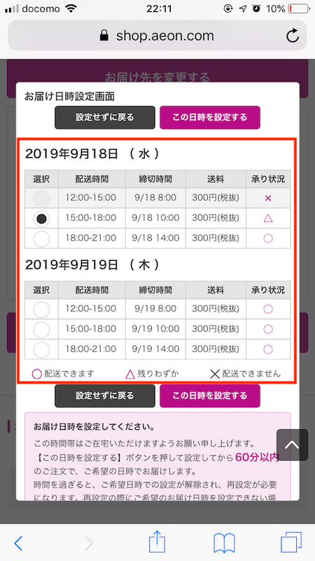 配送できるかどうかは「承り状況」で空きがあるかを確認できますが、締め切り時間のかなり前に×になることもありました。