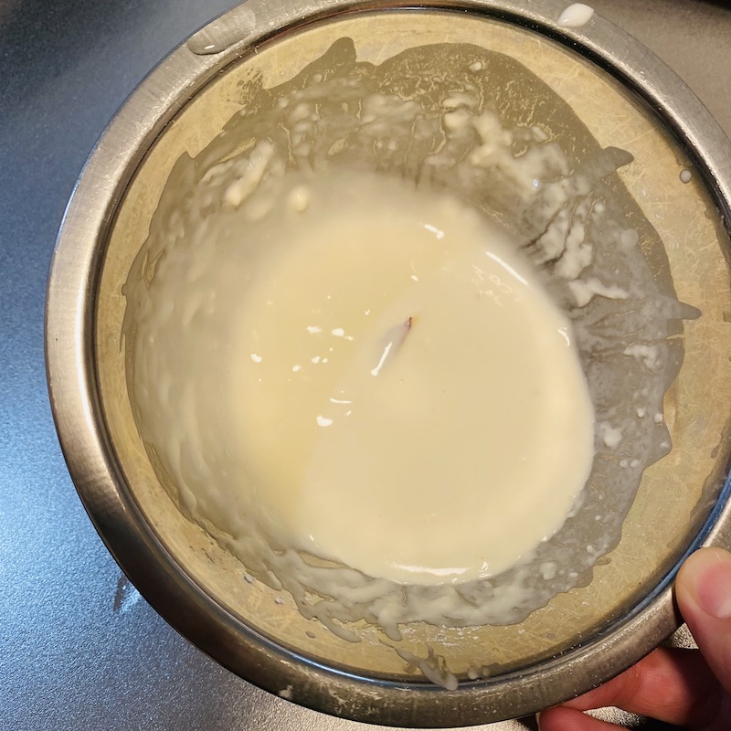 初めてで心配な場合は、小麦粉に少しずつ水を入れてかき混ぜて、小麦粉が上の写真くらいにゆるくなる程度になるよう少しずつ調整していけば大丈夫です。(*もし水を入れすぎてしゃばしゃばになったら、小麦粉をプラスすれば大丈夫です)