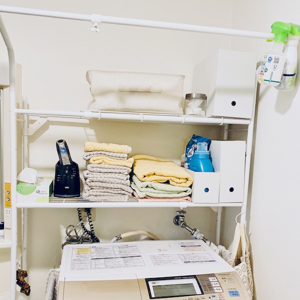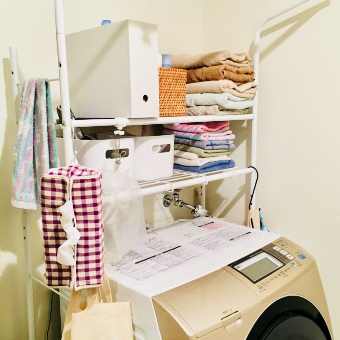 シンプルなインテリアが好みだけど、あまりに収納がないので洗濯機上を有効活用するため、ランドリーラックを使っています。