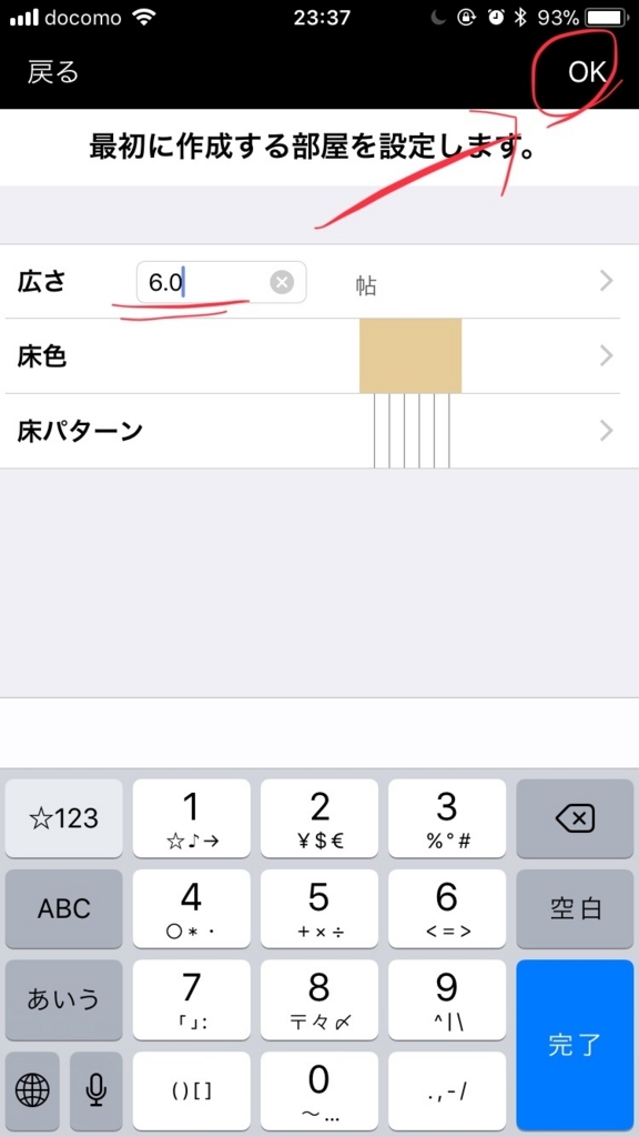 広さや床色は後から変更できるので、特に変更することなく「OK」ボタンを押します。