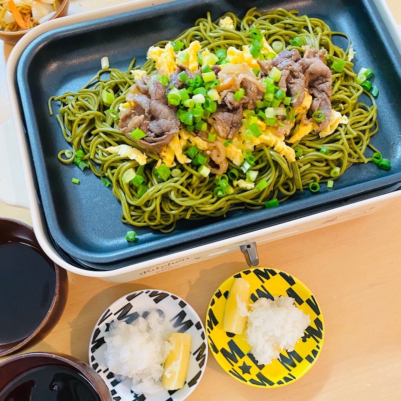 あとはつけつゆで食べればOKです。(うちの子供たちはいつも食べないので(汗)瓦そばを作る前に焼きそばをホットプレートで焼いてます。)