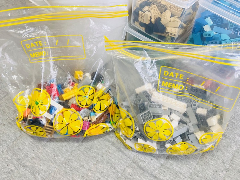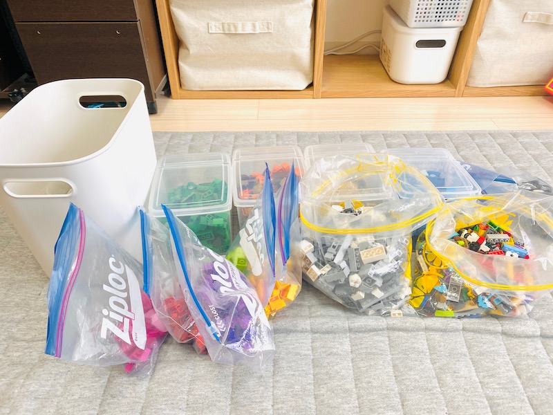 レゴは色や形別にジッパー付き袋に分けて、収納ボックスへ。
