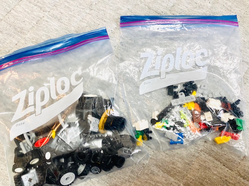 *この写真を撮ったときは完成しているレゴが多く、写真に写っているパーツは少なめ。でも、全ジップロックにパンパンにレゴを入れても大丈夫です。