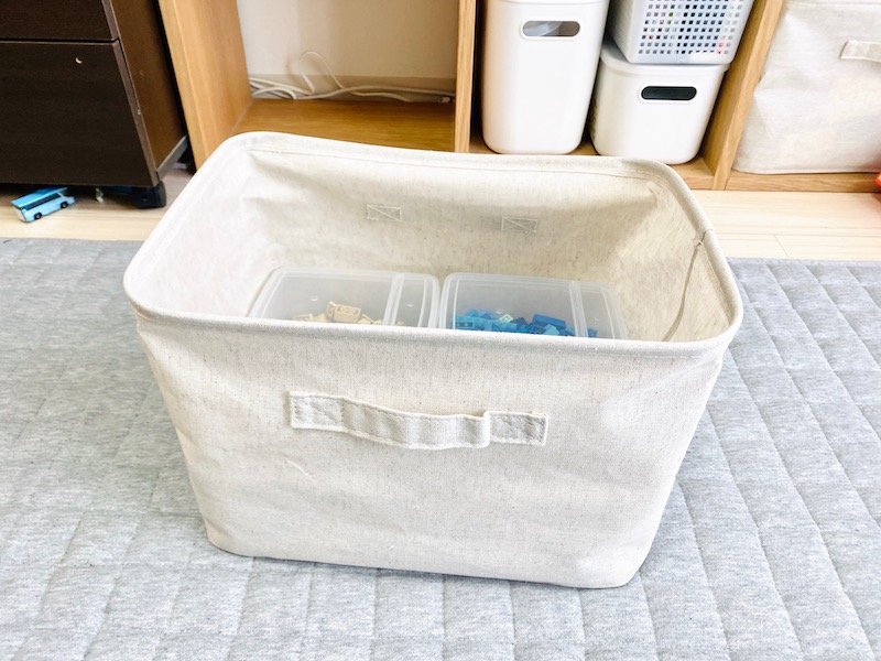 次に、数が多いレゴはセリアの蓋が立つボックスに入れています。
