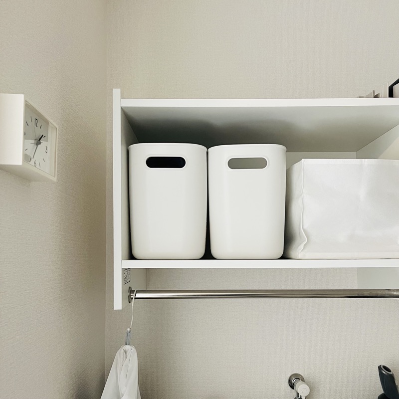 洗濯機の上に作り付けの棚があり最初は使いにくいなと思っていましたが、やわらかポリエチレンケースのハーフサイズ大を使うと下着収納にぴったり無駄がない。