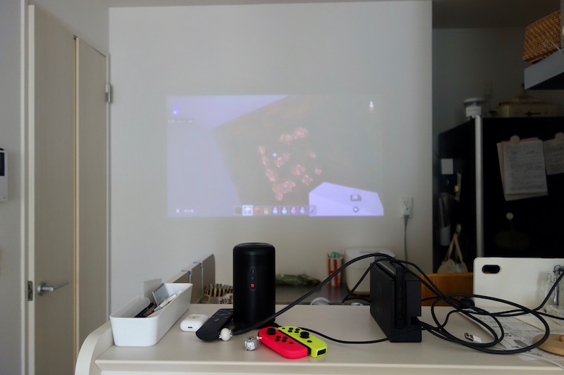 上の写真は夕方、カーテンを閉めてリビングの壁でスイッチ版のマイクラをしているところです。