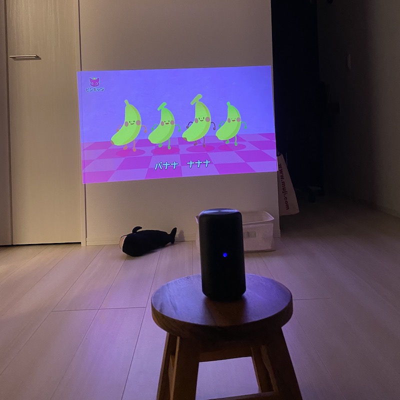 遮光カーテンじゃないこともあり、日中はどうしてもリビングが明るいのですが、少しでも暗い中でプロジェクターを使うために、電気を消して遊んでいました。