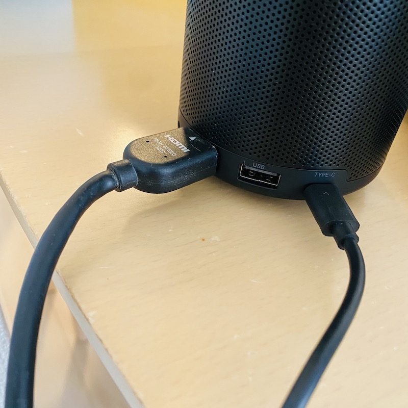 ▼ゲームやDVDを見るときは、こんな感じに本体下にHDMI接続します。(右は充電コード)