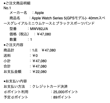 Apple Watchの金額が47,000円と考えるとびっくりですが、dポイントを利用したのでなんとか購入できる金額になりました。