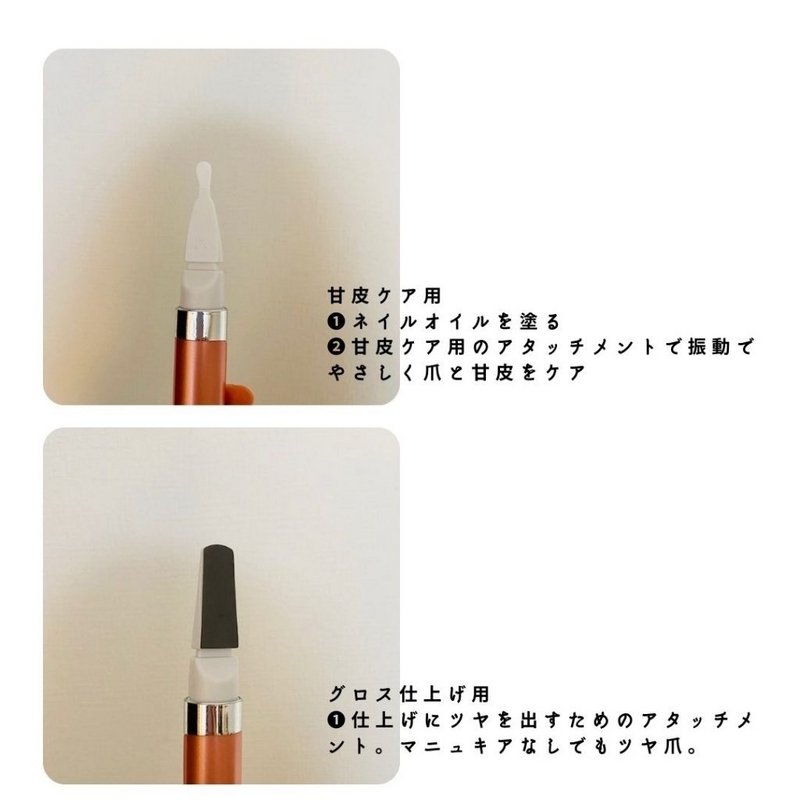 - 甘皮ケア用:ネイルオイルを塗って甘皮を振動でケアする
