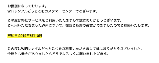 返却予定日の8月10日にヤマト運輸さんに持って行ったときは「到着するのは翌々日になる」と言われてドキドキしていましたが、ちゃんと8月10日が解約日となっていたので良かったです。