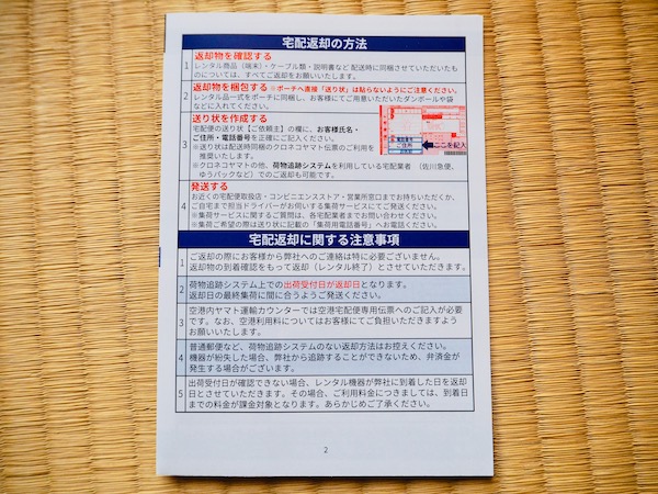 私は8月5日〜10日の6日間レンタルしたので、5日の午前中に到着、10日の17時までにヤマト運輸に持って行きました。