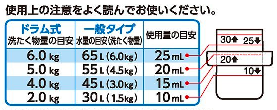 ドラム式 一般タイプ ヤシノミ洗剤 6Kgに25ml 45Lに15ml シャボン玉スノール 6kgに50ml 45Lに75ml